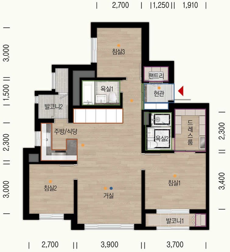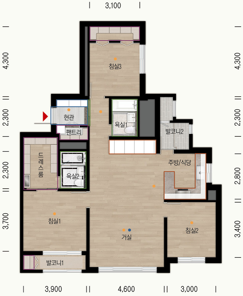 아래 평면도에서 유상옵션에 따라 구조 변경 가능할 예정입니다.