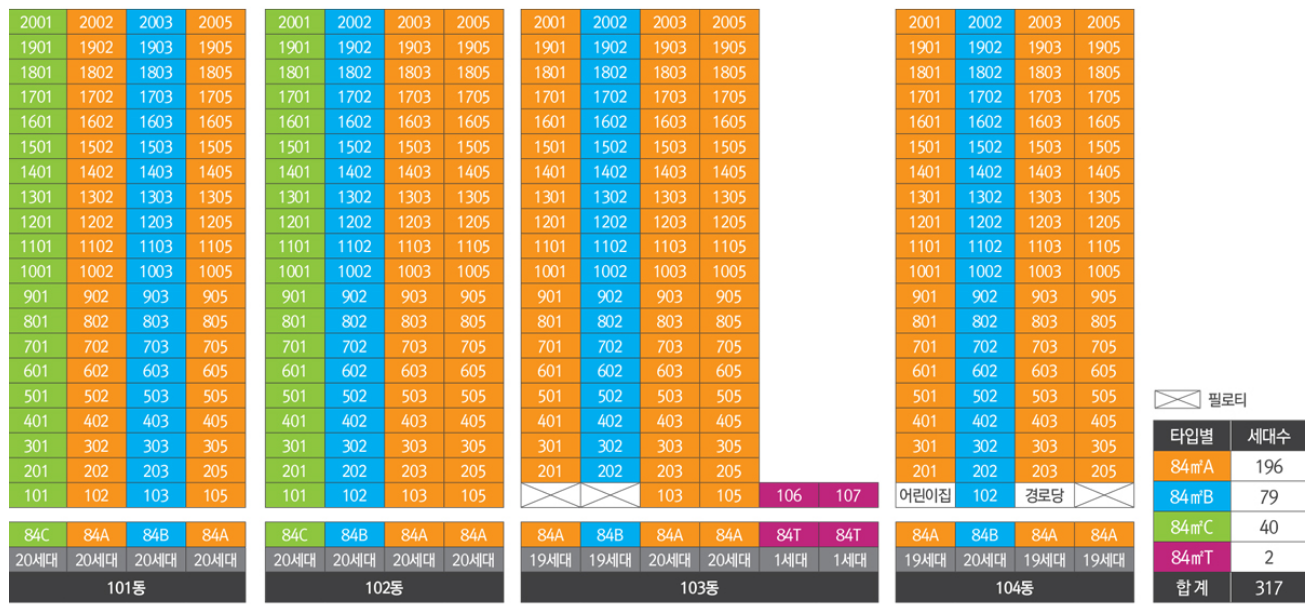 - 규모 : 지하 2층 ~ 지상 20층, 4개동, 총 317세대 (일반공급 26세대, 특별공급 93세대, 사전당첨자&이주자 198세대)